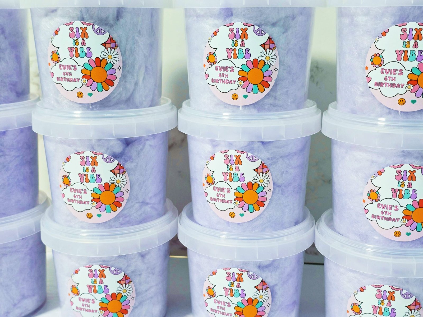 Our Personalised Fairy Floss Party Favour tubs are a fun, sweet and delicious party favour, perfect for adding a special touch to any celebration. Light, fluffy and beautifully presented, each tub is filled with soft fairy floss and finished with a personalised label to match your theme. They’re part of our popular , loved by kids and guests of all ages.